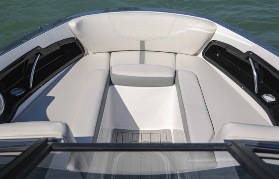 Na proa, há três paióis sob os bancos e um no piso. O cockpit, espaçoso, tem pia, dois pequenos armários nas laterais do console de pilotagem, mesinha removível, poltronas giratórias para piloto e copiloto e sofá com encosto rebatível na popa, para formar um pequeno solário ou um banco a mais. Parte do assento desse sofá fica sobre dois degraus que completam o ótimo acesso pela popa.