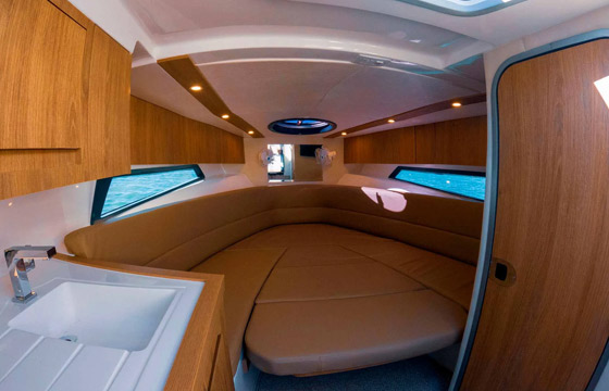 A cabine da FS 290 Concept possui cozinha completa com espaço para geladeira e microondas, um sofá em “U” conversível em cama de casal, e um amplo banheiro com armário, WC Elétrico, pia com torneira, ducha para tomar banho, lixeira e janela com abertura. Com um espaço amplo e confortável, a cabinada conta com o tradicional solário de proa, com ajustes de até 45 graus e guarda-mancebos adequados.