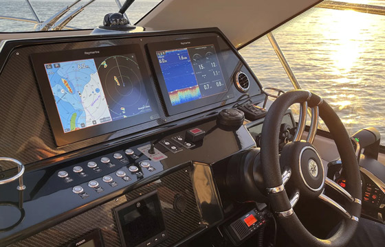 Um dos pontos altos da FS 360 Allure é a visibilidade, seja com o piloto sentado ou em pé. O hard top tem 1,90 m de altura, o que permite à maioria dos pilotos ficar totalmente em pé dentro. No posto de comando, a posição de pilotagem é uma das melhores entre as lanchas da categoria (teste revista náutica), tanto pela ergonomia quanto pela posição do piloto, com muitas possibilidades de regulagem.