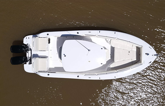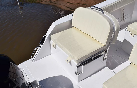 • Móvel de pesca em fibra de vidro, encosto com quatro porta varas em aço inoxidável, duas tampas, tábua de corte, pia, geleira com 40 litros de volume, vigia de acesso, pega mãos em aço inoxidável, porta